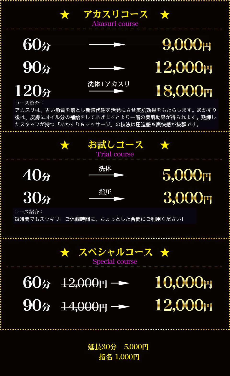 当店では、次のような行為は禁止とさせていただきます。*セラピストへの風俗的なサービスの強要*セラピストへのタッチ、暴言や暴力*施設内での盗聴・盗撮などの行為*その他、セラピストが嫌がる行為当店は風俗的なサービスは、一切行っておりません。以上のような行為が発覚した場合は、直ちに施術を中止させていただきます。その場合は施術料金のご返金は致しかねますので、ご了承くださいませ。ご利用上の注意を守り、最高の癒しの時間をお楽しみください。